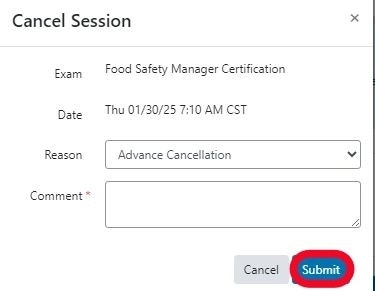 Enter your comment for the cancelation and then select Submit to cancel your session.