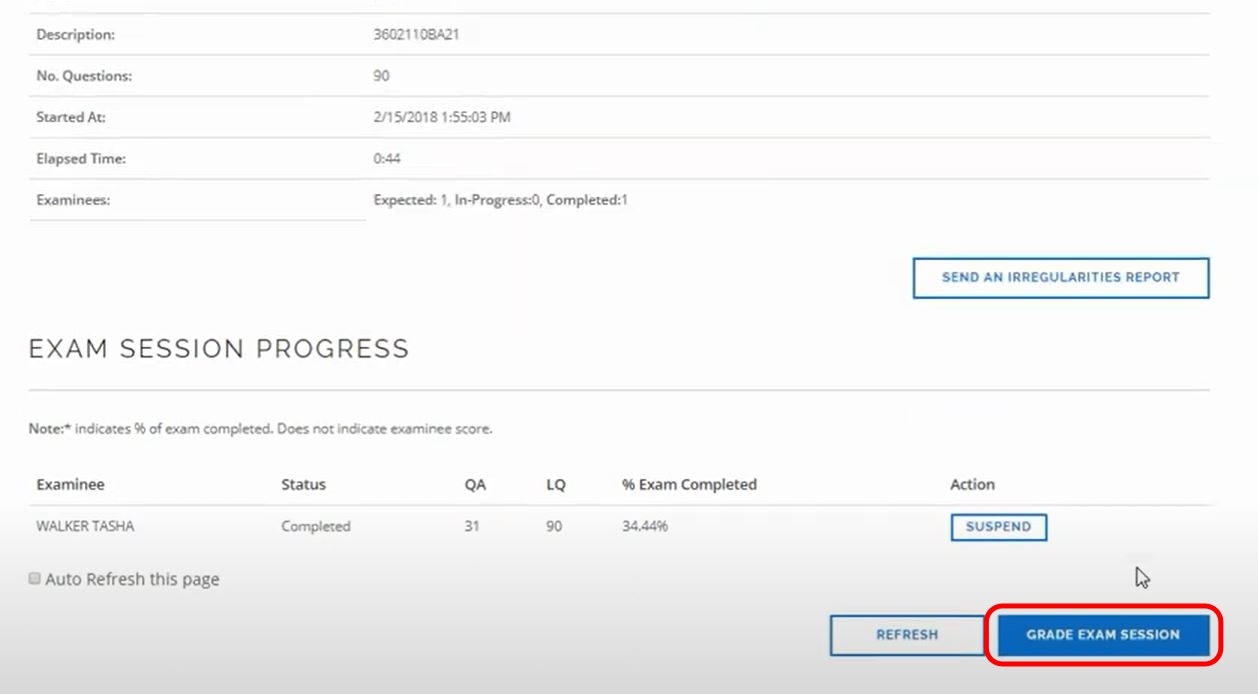 If all examinees have completed their exam 100% you will select GRADE EXAM SESSION. This will release the exam scores.