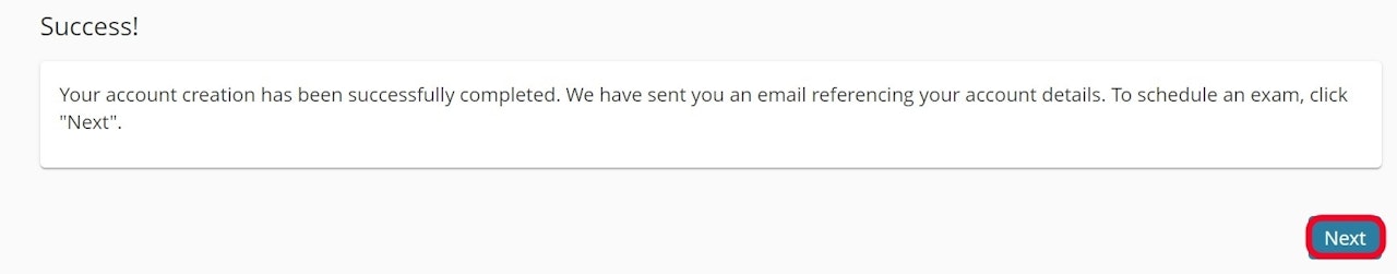 Your account has been successfully created! Select Next to return to your dashboard and schedule your appointment.