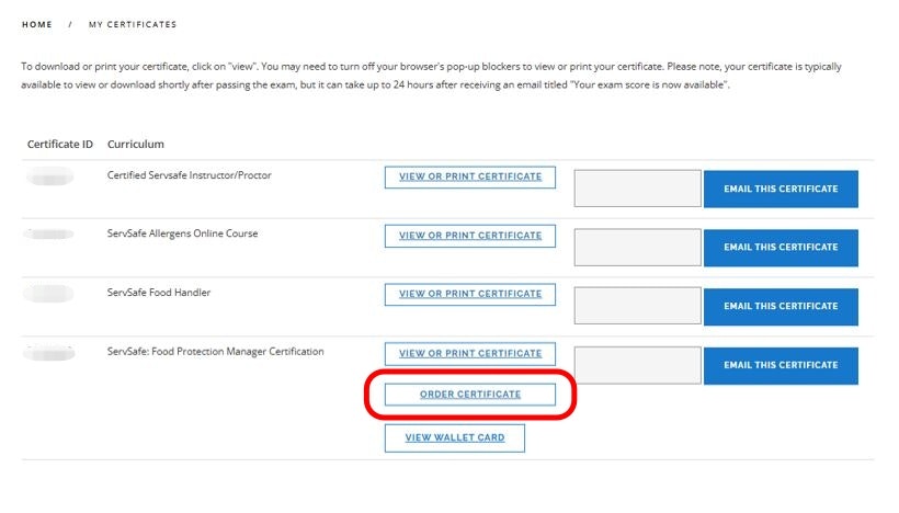 Only ServSafe Manager certificates can be purchased to be mailed by selecting ORDER CERTIFICATE and completing the checkout process.