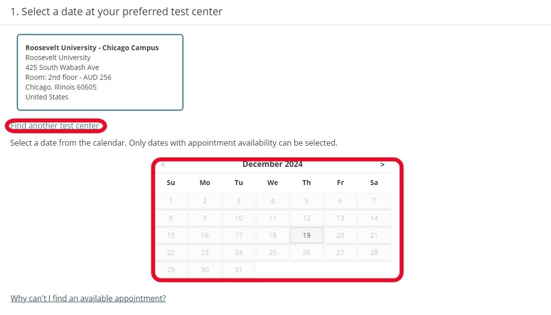 You can select a new appointment date at your current exam center or select Find Another Test Center to view available dates and times at other locations.