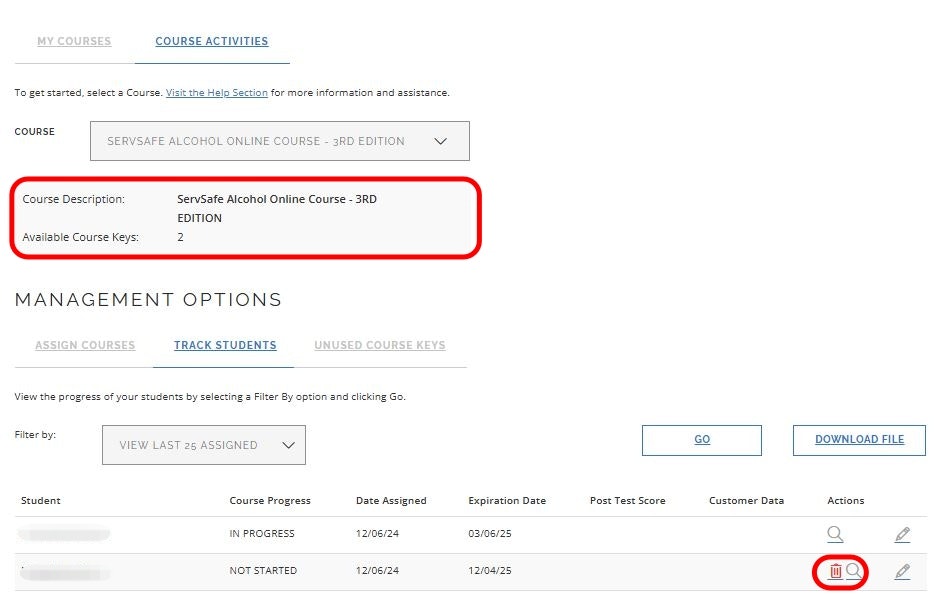 If the student has not started the course, a red trash can icon will be visible. By selecting this icon, this will remove the course from the student, allowing it to be reassigned to your course key pool.