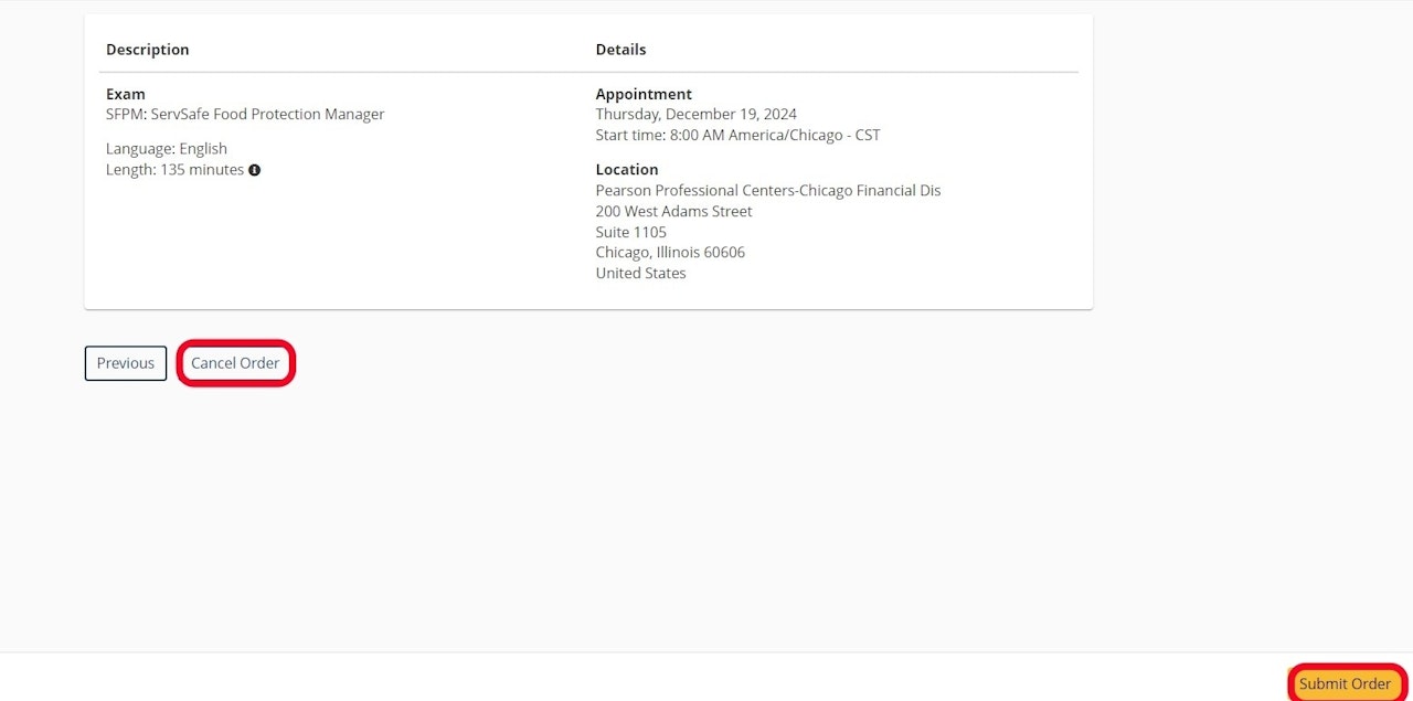 Finalize your appointment by selecting Submit Order, or choose Cancel Order to cancel.