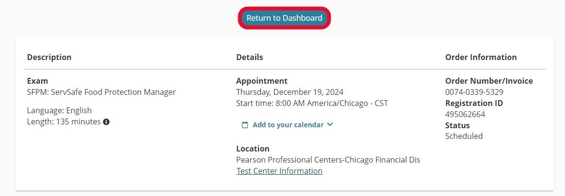 Your appointment confirmation, including date, time, and number, will appear onscreen, and a confirmation email will be sent. You may then return to your dashboard and log out.
