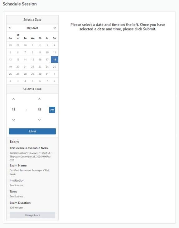 Available test dates and times will appear on the screen. Once a student has selected a date and time that works for them, they will select the Submit button to schedule the exam.